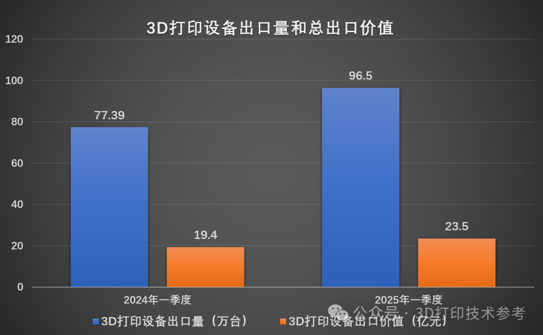 2025年一季度我国3D打印设备出口总量为96.5万台,相比去年同期的77.39万台增长24.7%;