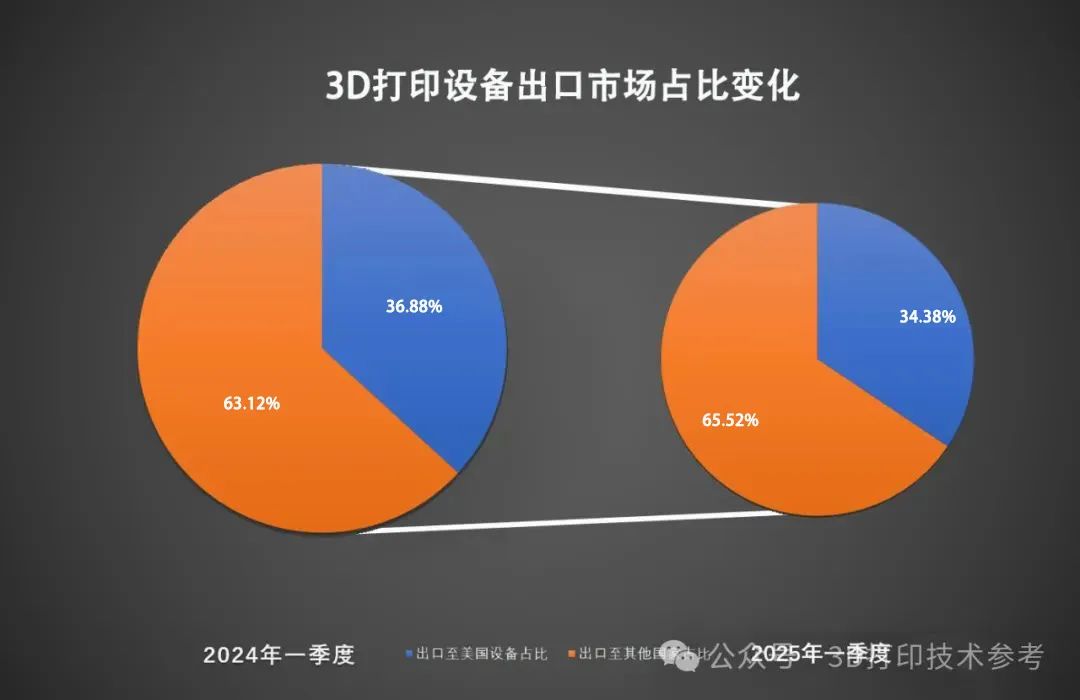 2025年一季度我国3D打印设备出口至美国市场的总量约为33.2万台,相比去年同期的28.5万台增长16.3%;占3D打印设备出口总量约34.38%,上年同期占比约36.88%,跌约2.5个百分点。