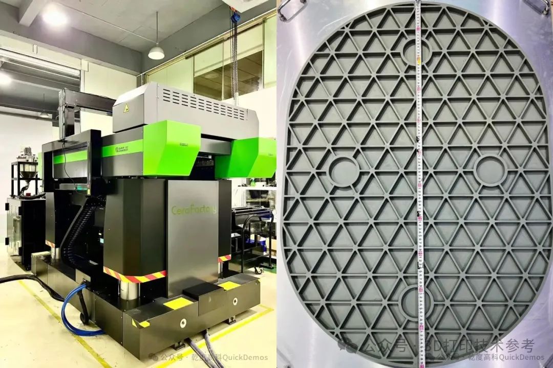 2024年,乾度高科推出“1.2米”光固化陶瓷3D打印装备,在独创的动态同步推扫技术加持下,打印体积可达1200×900×500mm, 横向曝光分辨率50μm,纵向重复定位精度 ±5μm(Z向)。材料体系覆盖氧化物陶瓷、碳化物陶瓷、氮化物陶瓷等。