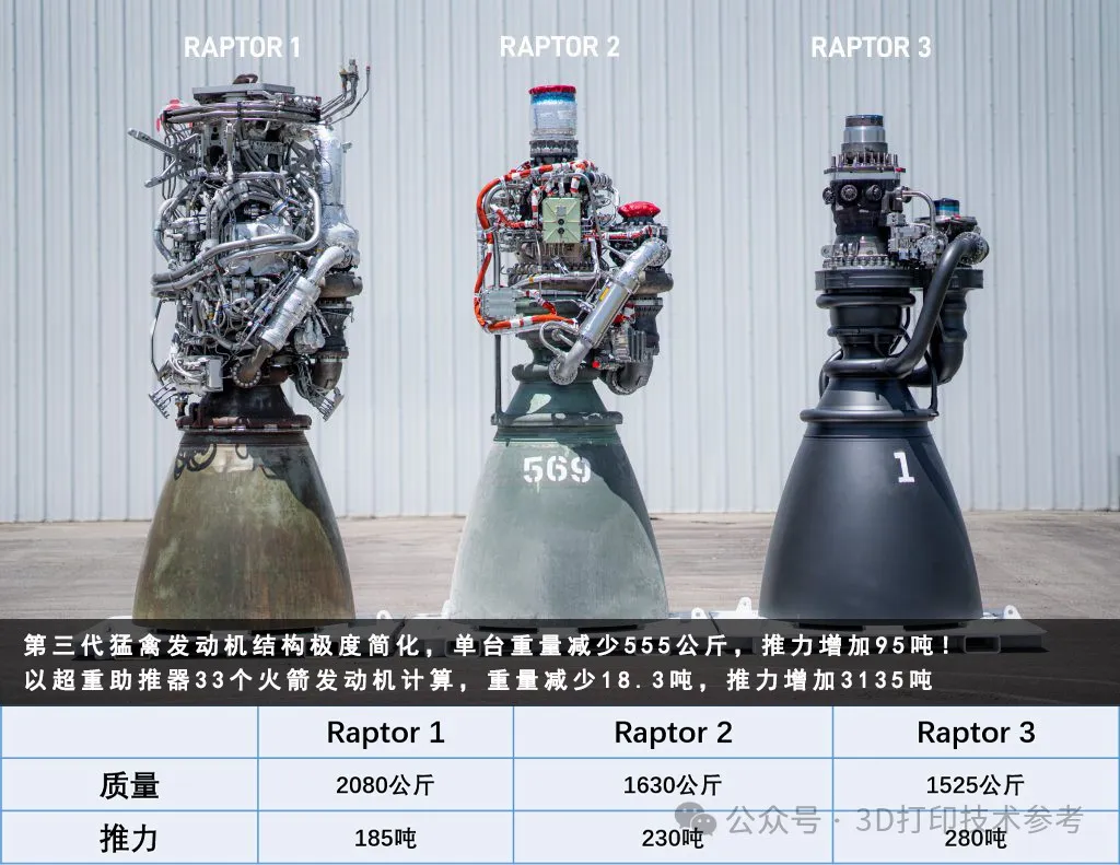 2024年8月,SpaceX首次展示了其第三代猛禽发动机(Raptor 3)。马斯克表示,该发动机大量使用金属增材制造技术,帮助实现大量零件整合、优化和轻量化。与上两代相比,Raptor 3极度简化,通过大量集成化制造,从根本上改变了发动机的核心架构;与此同时,成本大幅降低。