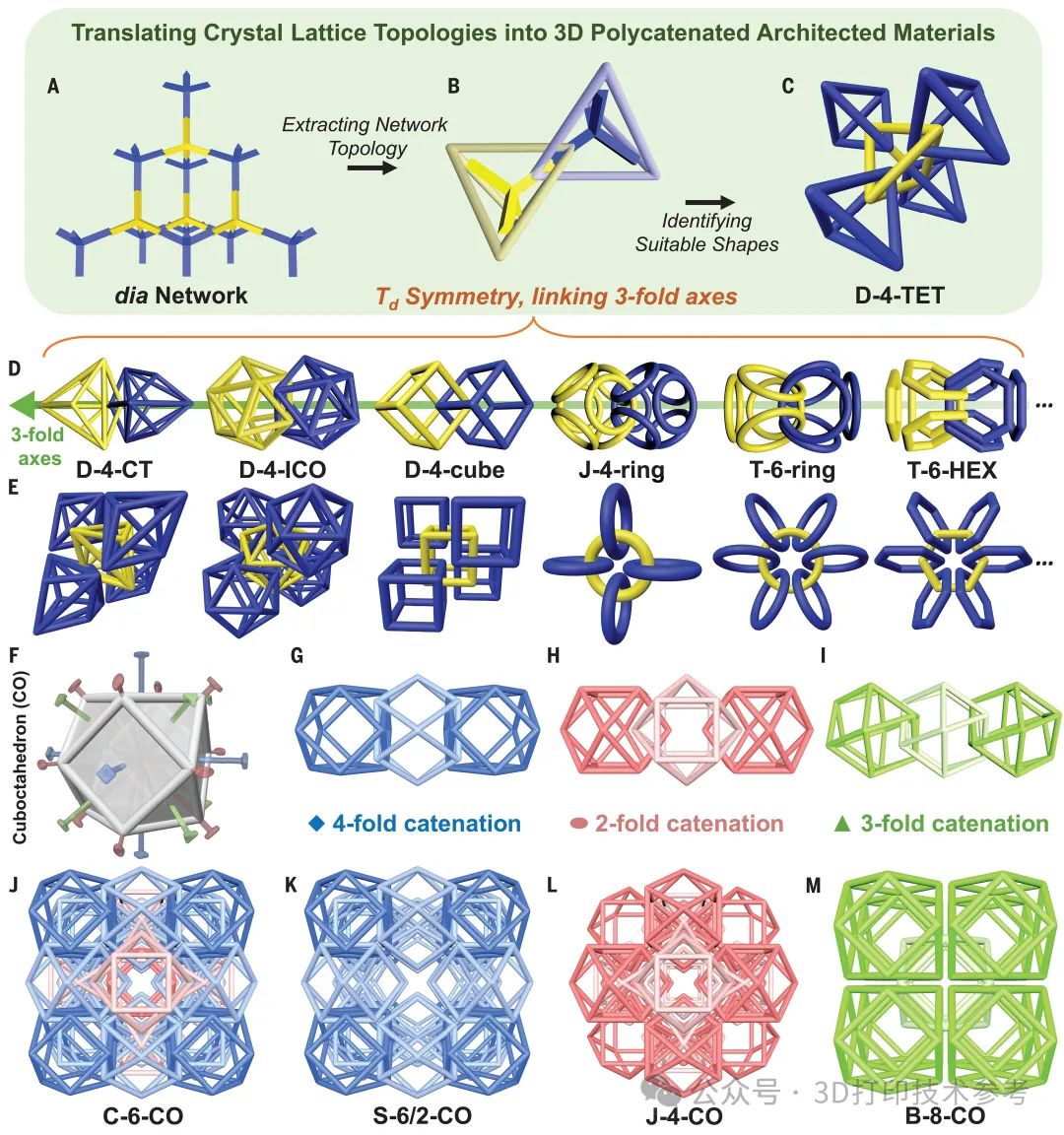 近日,3D打印技术参考注意到2025年最新的Science期刊以封面形式发表了一篇题为“3D polycatenated architected materials”的文章,介绍了一种新型的架构材料——3D多联结构材料(Polycatenated Architected Materials, PAMs)。作者为中国学者周文杰,现为加州理工大学博士后。