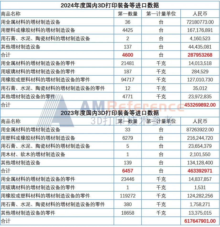 其中,金属增材制造设备仅36台,与2023年基本持平,数量占比0.51%,价值占比25%。用于塑料或橡胶材料的增材制造设备进口数量为4425台,数量占比96.19%,相比2023年数量减少1854台,总价值2.16亿人民币,价值占比46.74%,平均价格约3.77万,是进口数量最多的3D打印机类型。