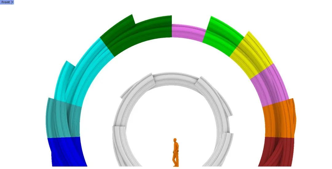 机械臂3D打印技术的优势在于其极高的制作灵活性和大尺寸非平面打印能力。本次舞台中的大小圆环采用了曲面打印技术,最大直径跨度达到16米。通过沿圆点发散性切断,每个单独部件以扇形分块制造,最终拼接成型,展现了传统工艺难以实现的复杂设计。