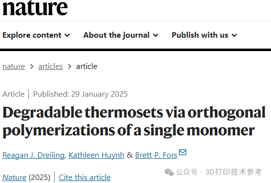 3D打印技术参考注意到,2025年首篇与3D打印技术相关的nature正刊文章,于1月29日发表。来自美国康奈尔大学的研究人员,发表了题为“Degradable thermosets via orthogonal polymerizations of a single monomer(通过单一单体的正交聚合制备可降解热固性塑料)”的文章。该研究的核心内容是关于一种新型可降解热固性材料的合成、性能调控以及其在光聚合3D打印中的应用潜力。
