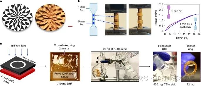 3D打印技术参考认为,该过程可进一步解释为:材料接受到的光线越多,交联作用就越强,材料就越硬;接受到光线较少的部分拉伸性能更高,而材料未接受到光线的部分则完全可以进行化学回收。因此所开发的热固性树脂可具有多样的物理性质,包括软、弹性、热可回收、酸可降解以及刚性和韧性等,而且还可以通过酸水解、热解聚和氧化降解等多种方法,实现选择性、顺序性的降解,降解产物能够重新聚合成新材料,形成了一个闭环的再利用过程。