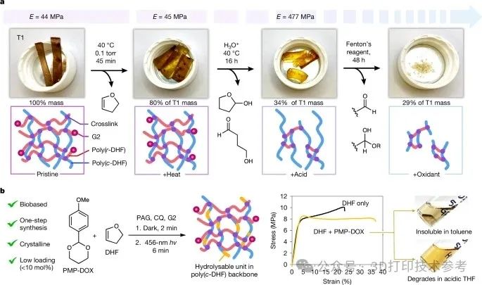 第一次聚合反应通过打开环状单体并将它们连接起来,形成了一种柔韧的长链结构,这种材料可以通过加热实现化学回收,并且能够通过酸进行降解。需要指出的是,并不是所有的DHF都会在第一次聚合中被消耗掉,剩余的DHF对于在后续聚合中增强材料的韧性至关重要。在第二步中,DHF单体相互连接并与第一次聚合反应的产物连接,形成一种高强度且具有韧性的交联聚合物。这种最终的交联聚合物不仅可以通过加热进行回收,还能在自然环境中逐渐降解。