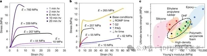 为了实现材料的可控合成,研究人员巧妙利用了光聚合技术。在反应初期,先进行缓慢的ROMP反应,留下部分未反应的DHF单体。随后,通过光引发剂在光照条件下产生强酸,触发DHF单体的阳离子聚合,实现交联反应。