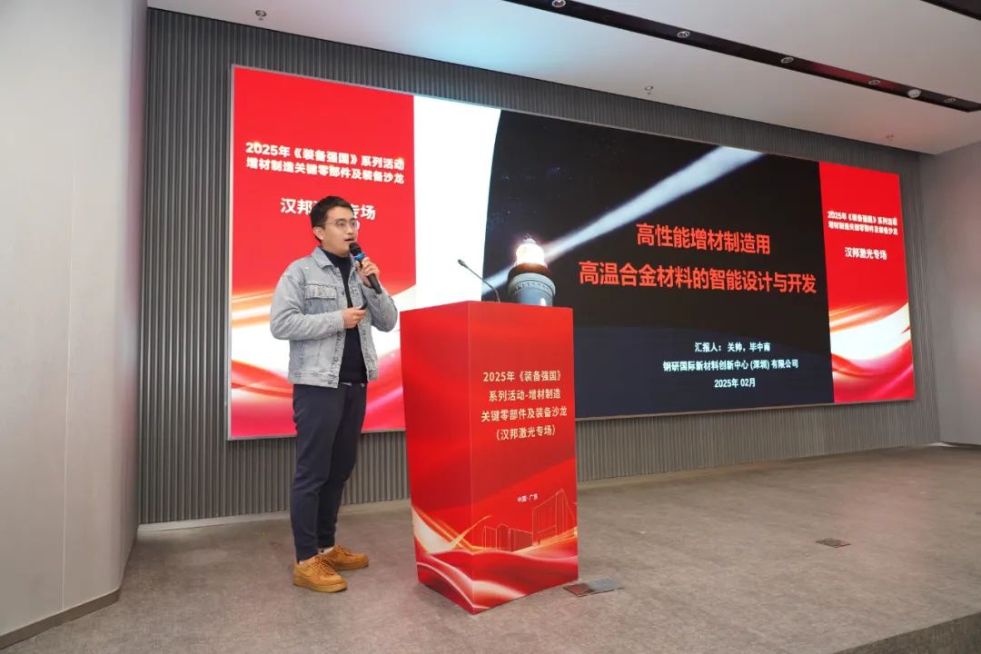 钢研国际新材料创新中心(深圳)有限公司 研发专家 关帅(代表钢研国际新材料创新中心(深圳)有限公司/常州钢研极光科技有限公司董事长毕中南)发表《高性能增材制造用高温合金材料的智能设计与开发》主题演讲,重点介绍了增材制造技术在高温合金领域的突破需求,从应用需求、存在问题、研究思路和技术路线等方面做出了全面的分析,并提出通过数据加AI的创新研发模式,实现了高性能材料的精准设计与开发,为航空航天等领域提供了关键解决方案。最后,他提出了未来AI+AM驱动先进金属材料研发的规划与展望,了解到汉邦激光在激光方面积累了多项核心技术成果,希望钢研与汉邦形成深度的研究与合作,共同实现更多增材制造新材料、新技术、新设备的突破。