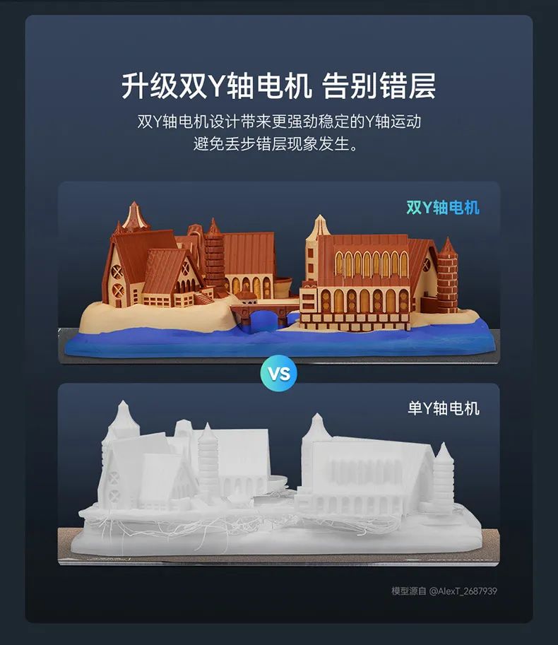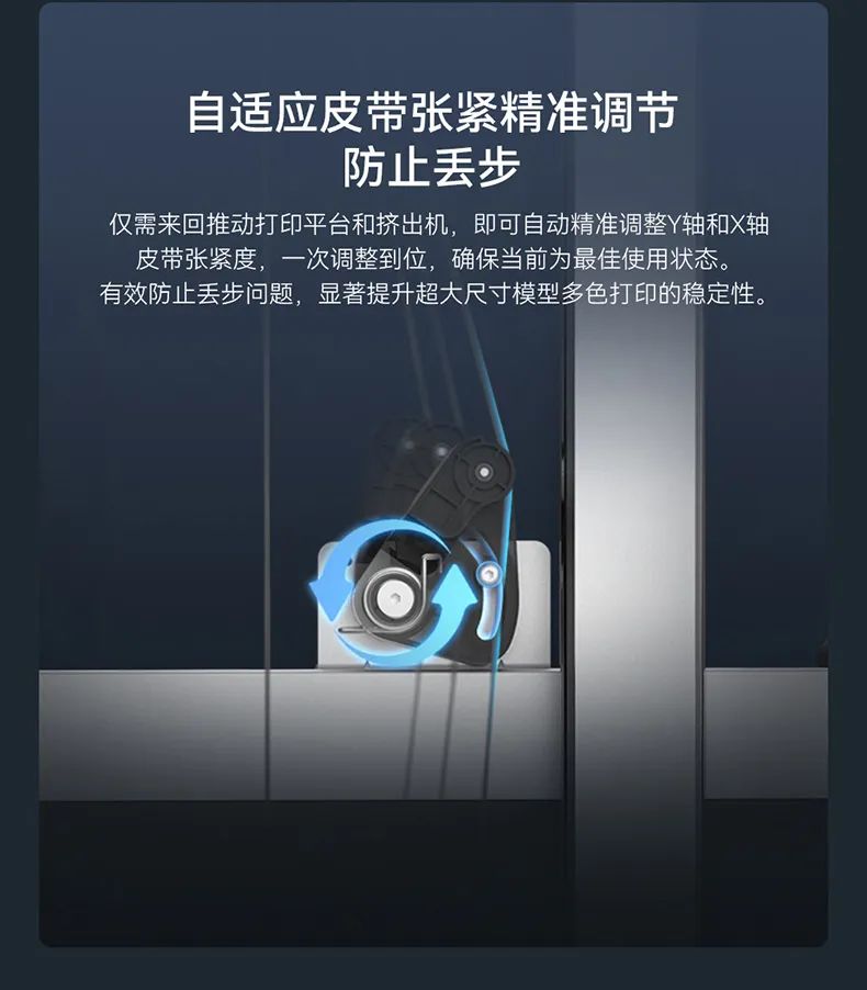 K3MC在硬件配置上同样不遗余力。它采用了双Y轴电机设计,有效减少了层纹现象,避免了丢步错层的问题。自适应皮带张紧精准调节技术的采用,仅需来回推动打印平台和挤出机,即可自动精准调整Y轴和X轴皮带张紧度,一次调整到位,有效防止丢步问题,显著提升超大尺寸模型多色打印的稳定性。此外,300度高温喷嘴、快拆热端等设计,也进一步提升了打印品质和用户体验。