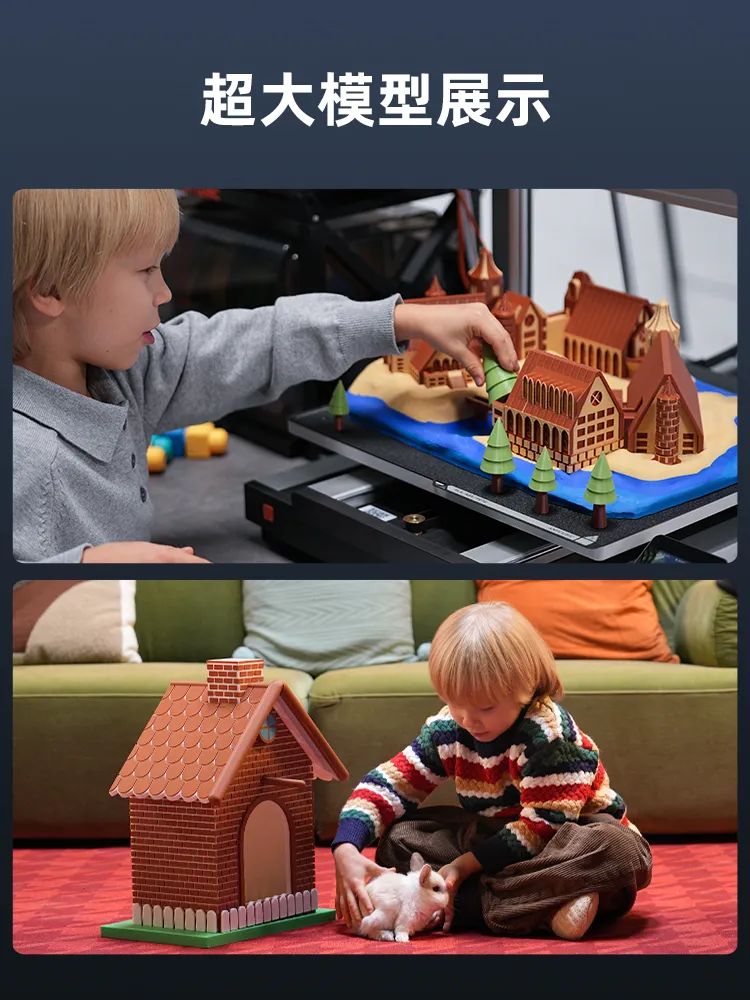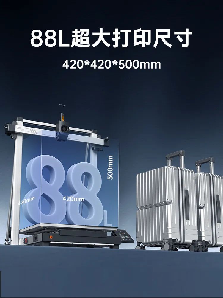 K3MC拥有420mm×420mm×500mm超大打印尺寸,构建出88L的超大多色打印体积,尺寸大过两个登机箱。这意味着用户可以轻松实现完整沙盘、宠物房子、巨型3D打印浮雕等大型模型的一体成型,无需分割拼接,确保作品的美观与完整性。无论是复杂的机械模型、精美的艺术雕塑,还是实用的家居用品,K3MC都能轻松驾驭,让创意不再受限于打印空间。