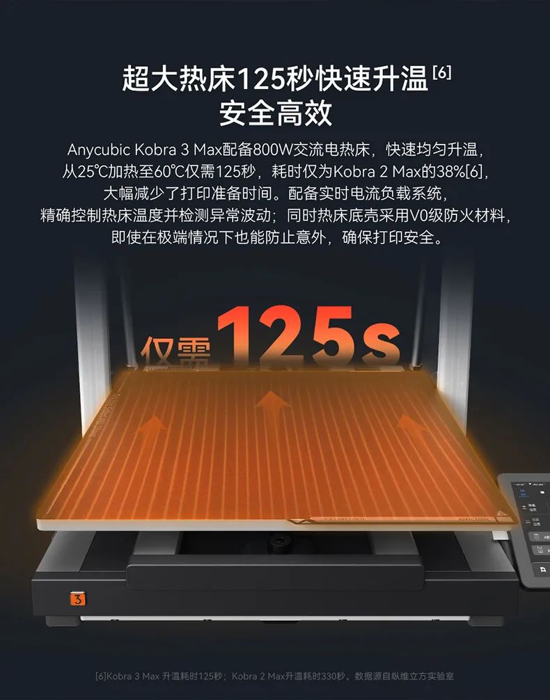 K3MC从25℃加热至60℃仅需125秒,耗时相比Kobra2Max缩短了62%,大幅减少了打印准备时间。热床底壳采用V0级防火材料,确保打印安全。同时,K3MC还配备了实时电流负载系统,可精细控制热床温度并检测异常波动,确保打印过程的稳定性和安全性。