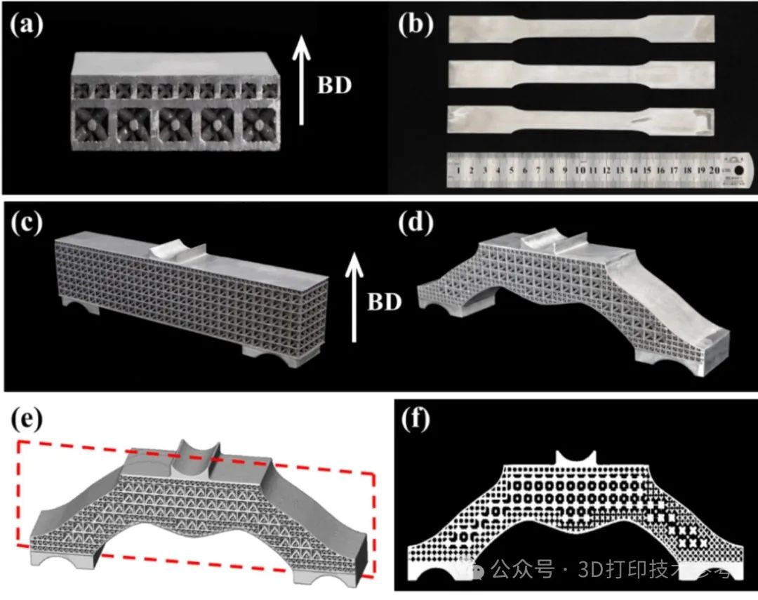 3D打印的样品:(a)八叉树设计的晶格体(b)拉伸测试样品(c)均匀填充的三点弯曲梁(d)拓扑优化的三点弯曲梁(e) CT 重建模型和 (f) CT 切片