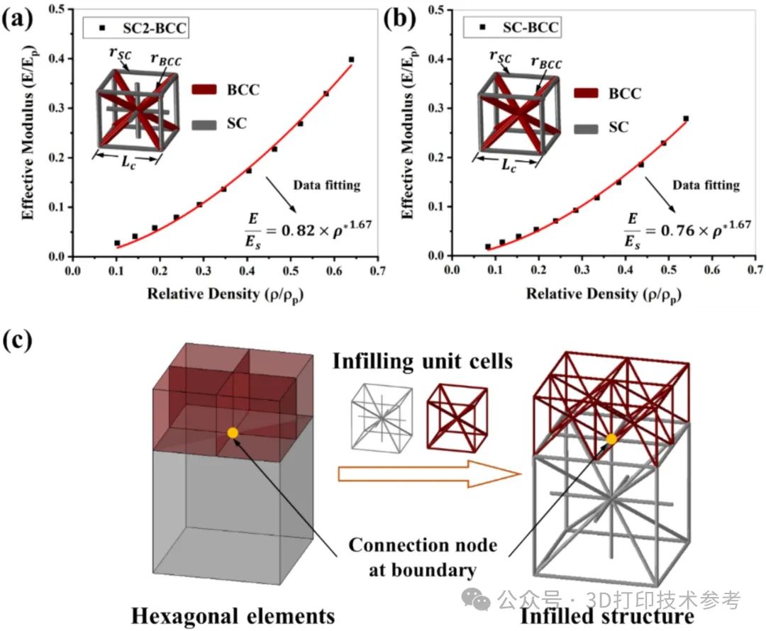 填充晶格晶胞的几何形状和有效模量:(a) SC2-BCC,(b) SC-BCC 配置和 (c) 两种类型晶胞之间边界处的连接