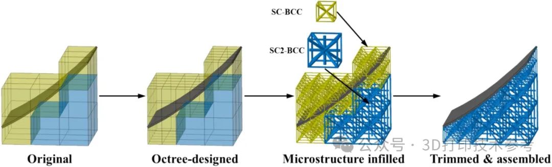 研究人员提出了一种优化设计方法,用于自支撑增材制造格填充结构,该方法同时优化了微观结构的相对密度分布和宏观几何形状。微结构根据局部相对密度填充到处理后的均质域中。在内部格芯的边界区域应用八叉树设计,以在增材制造过程中为顶部壳体提供足够的支撑。最后,将分别设计和建模的紧凑壳体和内部格芯组装在一起。
