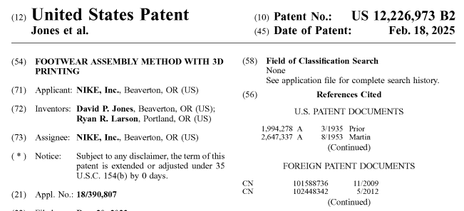 该专利由耐克David P. Jones和Ryan R. Larson主导研发。Jones是多项与服装装配直接3D打印相关的专利共同发明人,而Larson则是耐克鞋履缓震创新部门的总监,也是公司增材制造领域的活跃人物。这项专利最初于2023年12月提交,2024年4月公布,并于本周正式获批。