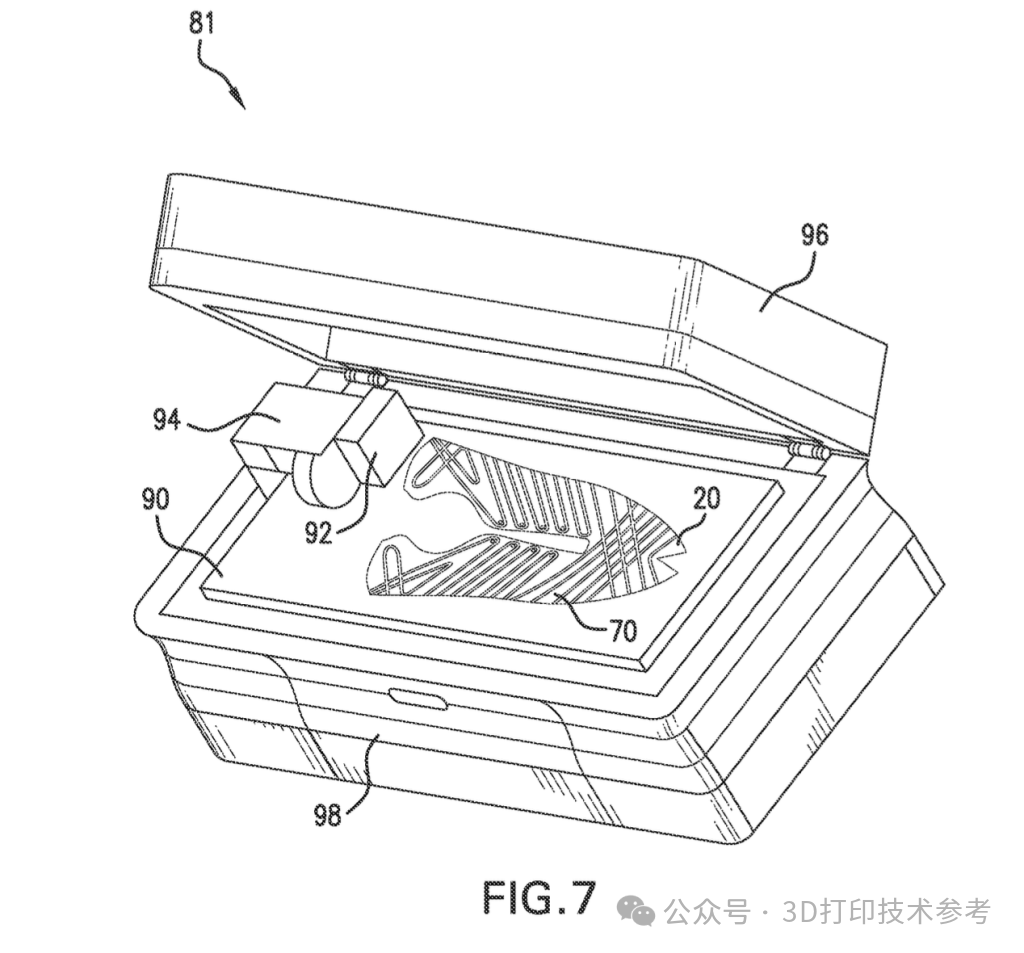 耐克的这项专利不仅适用于运动鞋,还涵盖了篮球、足球、自行车、网球、棒球、交叉训练和徒步等多种运动鞋履。此外,该技术还可用于制造正装鞋、乐福鞋、凉鞋、拖鞋、船鞋和工作靴等其他类型的鞋履。专利还指出,这种3D打印工艺不仅限于鞋履,还可以用于制造服装、服饰和装备,如帽子、夹克、衬衫、手套以及其他由织物、皮革、橡胶和泡沫制成的运动装备。