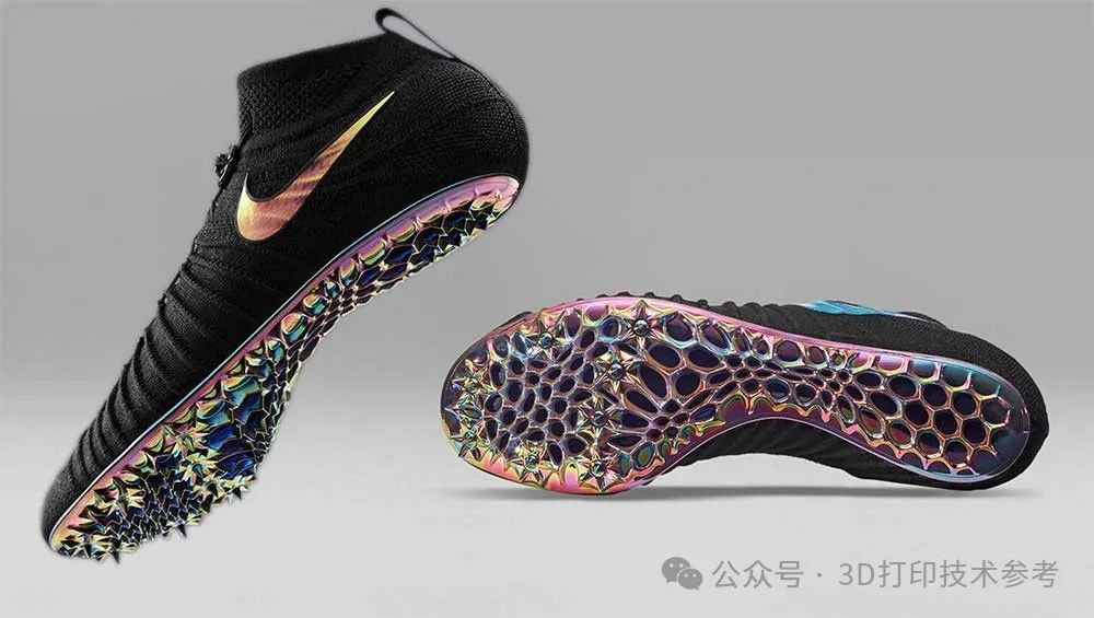 耐克在3D打印领域已经深耕十余年。2013年,耐克推出了首款3D打印足球鞋——Vapor Laser Talon,采用选择性激光烧结(SLS)技术制造鞋钉,将重量减轻至158克,提升了运动员的冲刺速度和抓地力。此后,耐克与惠普(HP)合作,利用Multi Jet Fusion(MJF)3D打印技术加速设计迭代过程,并为多位奥运冠军定制3D打印鞋履,包括短跑名将Allyson Felix和Shelly-Ann Fraser-Pryce。