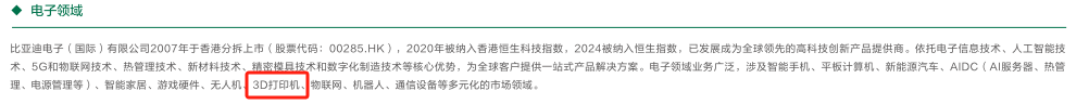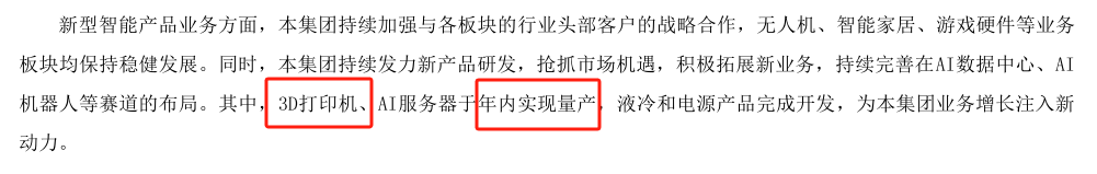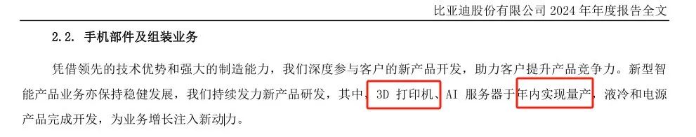 更关键的是,比亚迪财报中包含与3D打印相关的信息。在手机部件及组装业务,比亚迪通过技术创新不断提升产品竞争力,推动新型智能产品业务发展,如3D打印机、AI服务器于年内实现量产,液冷和电源产品完成开发。