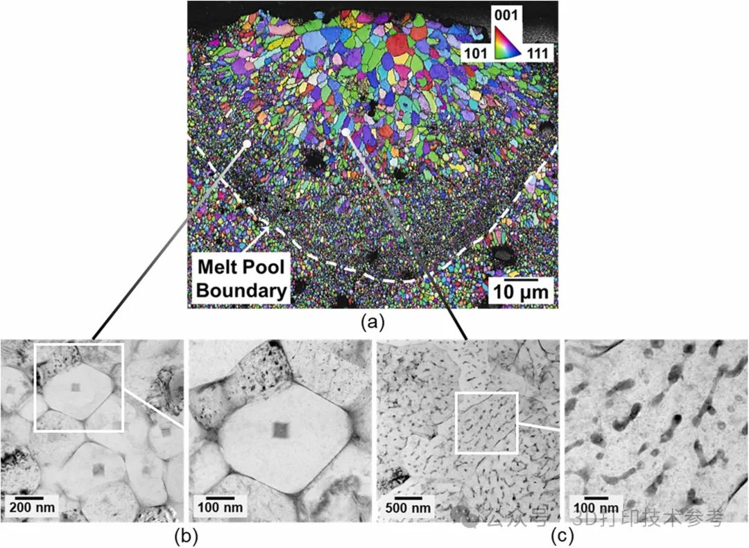 7A77单道微结构的SEM-EBSD IPF-Z颜色图显示了熔池边界处的细晶和过程中心的粗晶