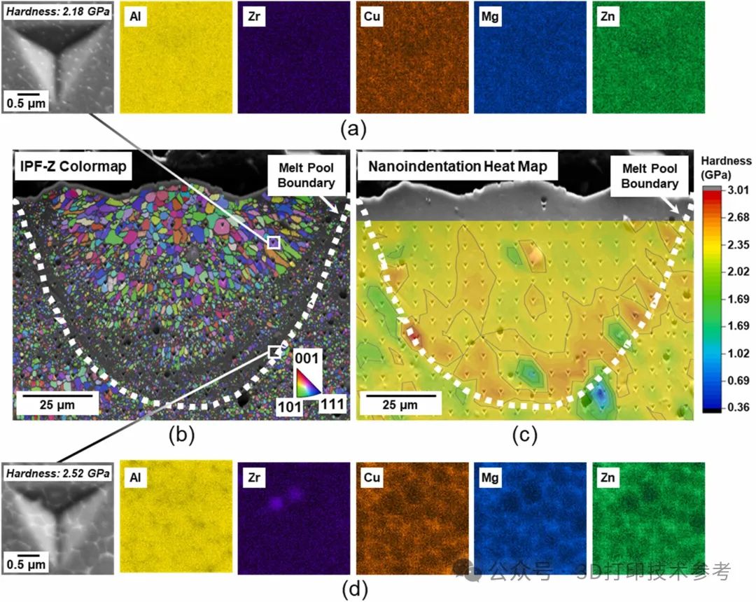 纳米压痕图叠加在AA7A77单道SEM图像上和相应的IPF-Z颜色图。(a)(d)SEM图像和EDS元素分布图,显示在(d)细晶和(a)粗晶区域内的特征压痕