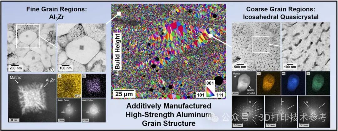 NIST的研究人员以7A77铝合金为研究对象,考察了其在多个长度尺度上的原始微观结构。分析表明,激光3D打印为其微观结构中引入了多种亚稳相。具体来说,他们在3D打印的7A77铝合金中发现了明显的双峰微观结构:含有Al₃Zr相的细小等轴晶粒和以一种以前从未报道过的较粗晶粒,后者具有二十面体准晶特征。其中,细小等轴晶粒分布在靠近熔池边界处,而熔池中心则为较粗的拉长晶粒。