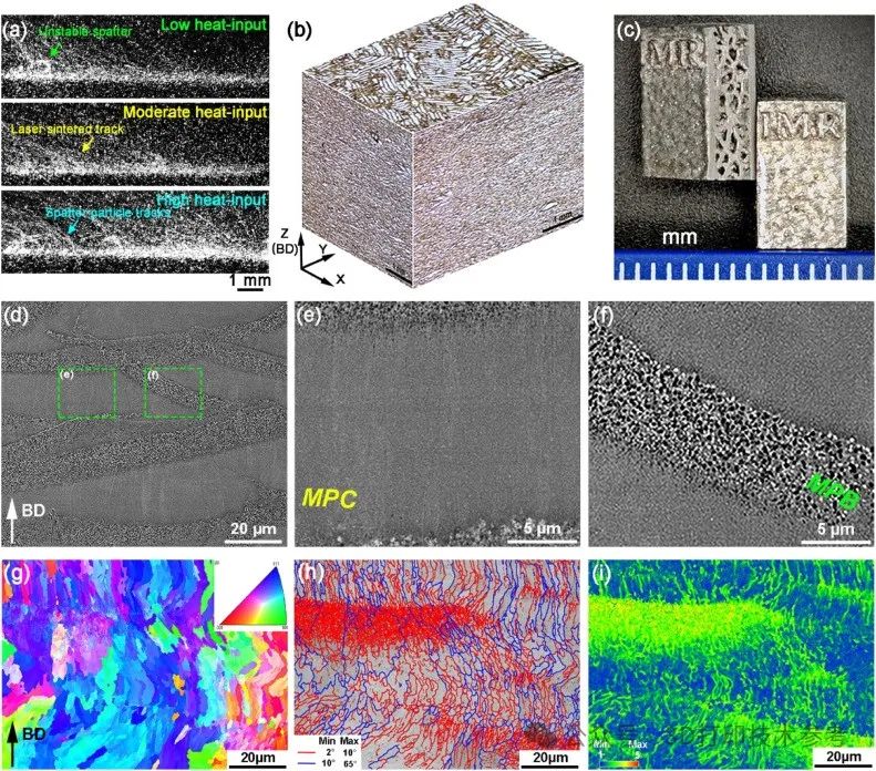 (a) 在不同热输入条件下高速相机拍摄的熔池堆叠图像。(b) 用最佳参数制造的热处理样品的3D显微组织图像。(c) 复杂结构样品的宏观图像。(d) 与BD平行的热处理样品的SEM图像。局部放大的SEM图像:(e) 熔池中心和(f) 熔池边界。(g–i) 与BD平行的热处理样品的EBSD结果:(g) 逆极图(IPF)图,(h) 晶界分布和(i) 核平均旋转(KAM)图
