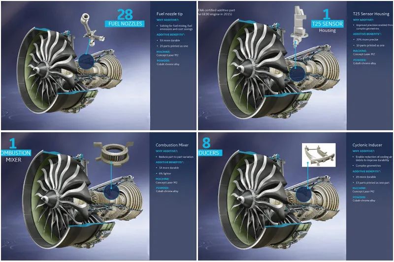 目前,在高温合金的增材制造领域中主要以镍基高温合金的研究占主导,因为它是飞机发动机热段中涡轮机叶片等结构部件的首选材料。与镍基合金相比,钴基高温合金显示出更好的可焊性,因此降低了3D打印工艺过程中的裂纹敏感性。其中钴基超合金被认为是镍基合金在高温结构和功能应用中的最有前途的替代品。根据3D打印技术参考的日常总结,GE9X的燃油喷嘴、导流器、燃烧室混合器、T25传感器外壳等,均使用钴基合金3D打印。