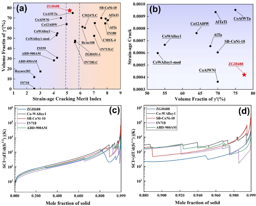 总之,这种新型的抗裂Co-Al-W基高温合金ZGH688具有优异的力学性能,可应用于内燃机及航空发动机系统。其内部γ′-Co3(Al,W)相的体积分数占比几乎是普通镍基合金的2倍。尽管γ′的含量较高,但Co、Ta、Al、W和Ni元素的合理配比使Co-Al-W基合金体系具有较小的MSAC、SAC和SCI值,使ZGH688表现出优异的力学性能。这些发现表明新开发的Co-Al-W基超合金在增材制造领域具有巨大的潜力。