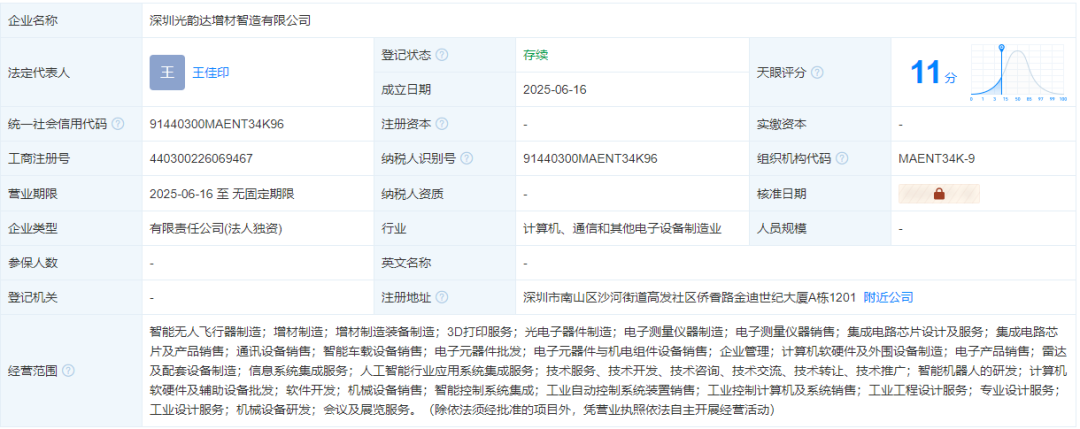 6月6日,深圳光韵达增材智造有限公司成立,注册资本1000万元,经营范围包含:智能无人飞行器制造;增材制造;增材制造装备制造,智能机器人的研发