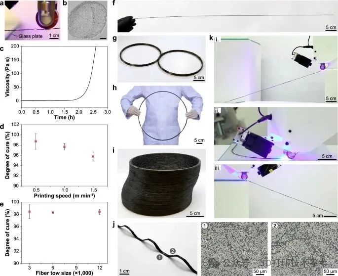 3D打印技术参考注意到,来自美国亚利桑那州立大学的Mostafa Yourdkhani的副教授领导的研究团队在碳纤维3D打印领域取得新的研究进展,使用该技术可以快速、可扩展地制造高性能复合材料,能够实现连续和不连续纤维的无工具、无支撑、无需后固化的高质量3D打印,材料的纤维含量高达70vol%,接近零空隙,可在半空中打印。