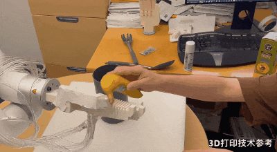 在这项研究中,3D打印被用于制造机器人的混合软-刚性气动手以及手动剪切拉胀执行器。其中,前者使用树脂喷射光固化3D打印成一体结构,结合了柔性手指和刚性核心,由15个气动通道控制。这种复杂的结构很难用传统制造方法实现。