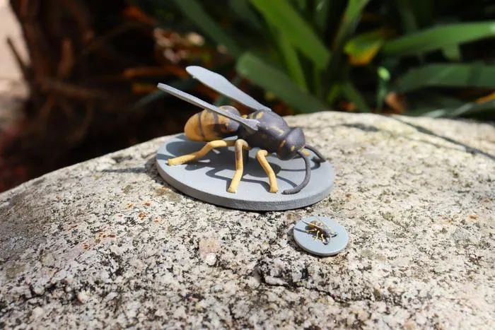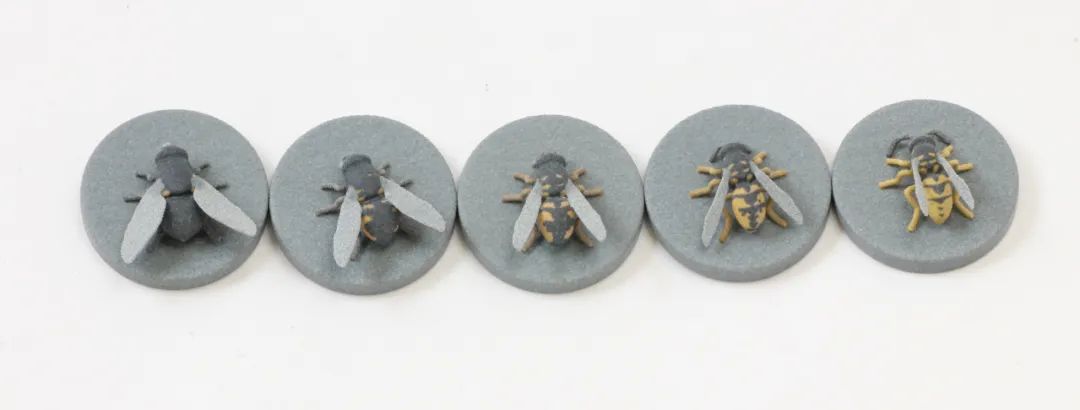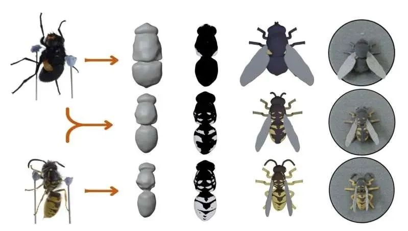 在这项研究中,科研人员使用了HP的彩色3D打印机制作了高度逼真的昆虫模型,来测试捕食者对不同模仿形态的反应。他们首先通过三维扫描获取了黄蜂和食蚜蝇的高分辨率数字模型,随后使用专业3D建模软件(如Blender)对模型进行变形处理,在形态空间中创建出介于真实物种之间的连续变异表型,例如25%、50%和75%相似度的中间形态,甚至超越真实物种范围的极端表型。