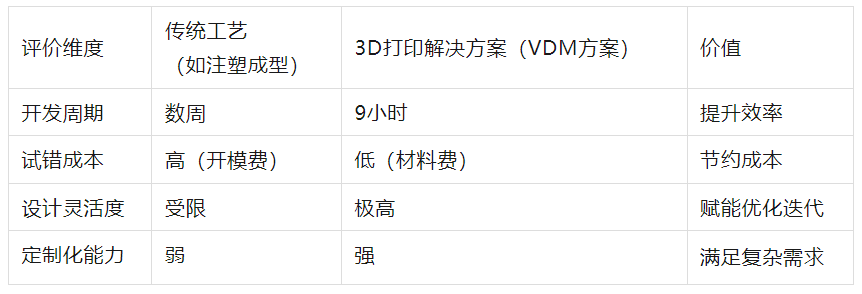 此次玻璃功能支架零件的总打印时长仅为9小时。3D打印技术成功将支架原型制造周期从传统工艺所需的“数周”缩短至此。这不仅实现了设计与制造效率的极大飞跃,更通过VDA软件的多角度保障功能,有效确保了打印成功率,显著减少了不必要的材料与时间损耗。