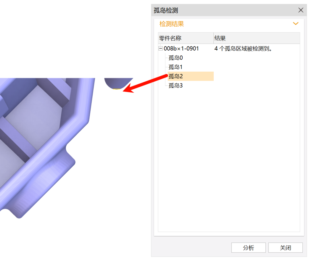 孤岛检测功能帮助检查出需要但未添加支撑的区域。在工作量比较大的情况下,工程师无法估计到零件处理的方方面面,自然会出现人为的失误。孤岛检测功能能够有效规避因支撑不足而导致单独轮廓无法被固定,进而引发与刮刀干涉碰撞,最终导致打印失败的风险。