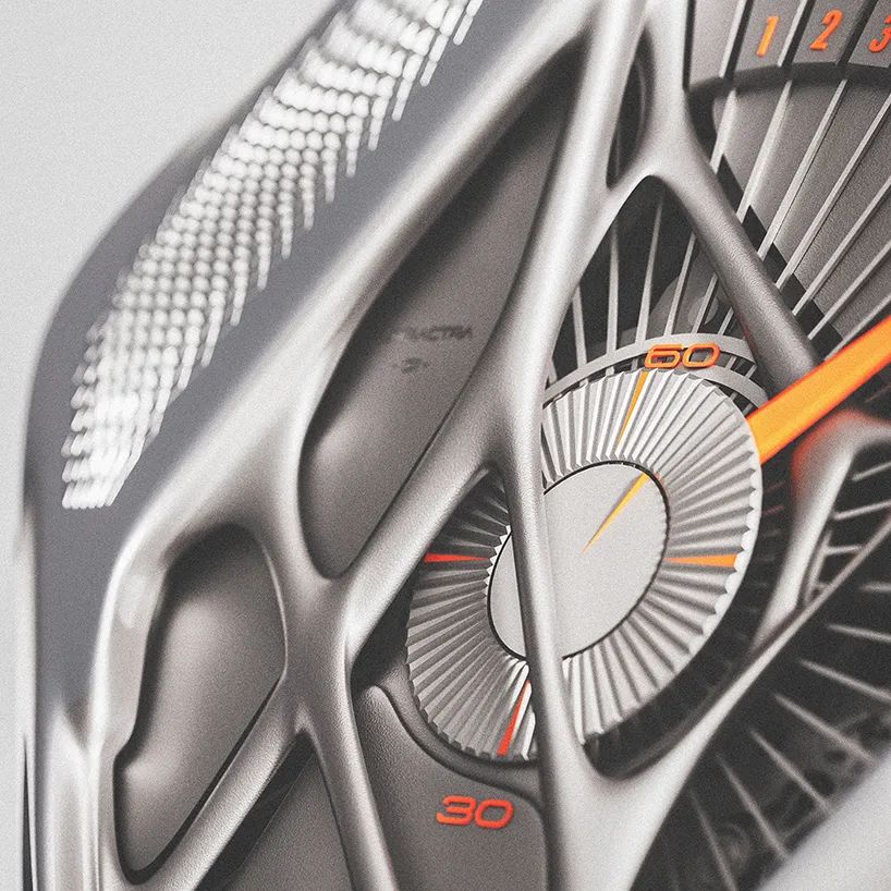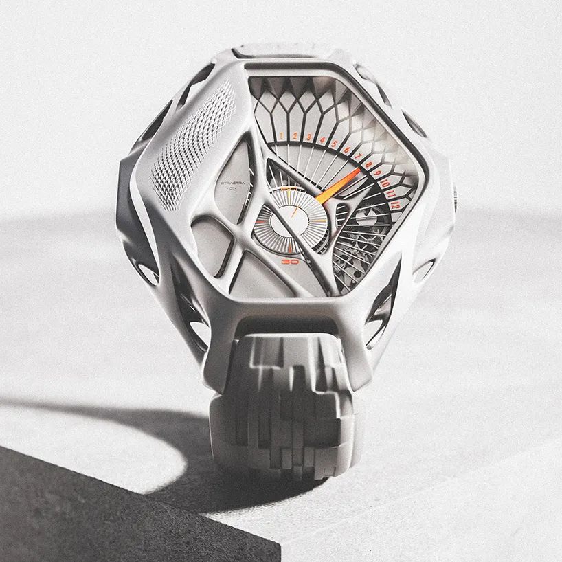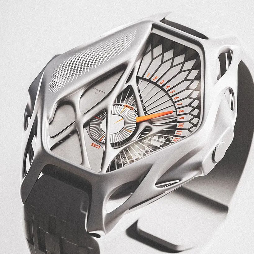 一家名为Ayoub Ahmad的公司打造出一款名为STRACTRA的3D打印钛金属概念腕表。这款表的小时刻度呈现在180度的几何弧线之上,其表圈受自然启迪呈现出树枝状的图案,在腕表右侧弧线形成规整线条。在这些有机结构的空隙间,小时数字、指针均以日落橙色为主色调,在钛金属的配色衬托下十分显眼。此外,分钟刻度在指针下方呈360度圆环环绕,让这款3D打印钛金属概念腕表的报时功能更为完备。