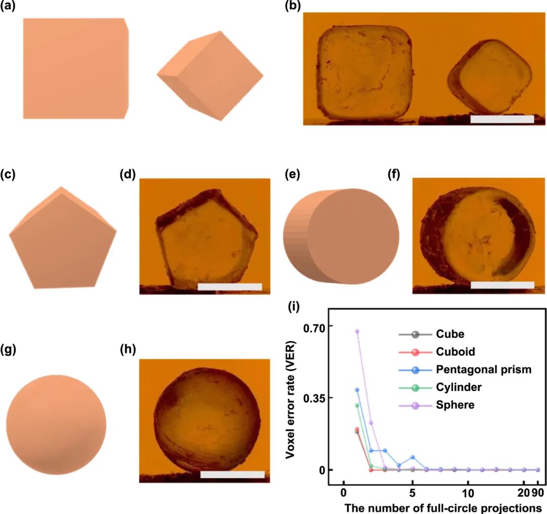 为了测试该系统,研究团队打印了各种形状。立方体仅用四个投影打印,而圆柱体和球体则需要八个。更精细的模型,包括一个名为“思想者”的人形,则用12或15个投影完成,与用360度投影打印的模型非常相似。使用标准图像比较工具对结果进行评估,在所有情况下,使用15个投影的打印件在结构相似度和图像质量方面的得分均超过0.9。