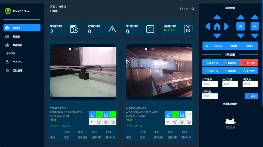 深度集成的云平台,提供远程监控、任务管理、耗材管理、数据管理、AI视觉识别等一站式智能化服务。 为教授/管理员创造了更易于管理的平台,无论身处何地,手机/电脑实时查看多台设备状态、打印进度,月度/季度/年度的数据分析,实现高效、透明的实验室管理。操作员/学生可以随时随地提交打印任务,摆脱繁琐的本地操作。