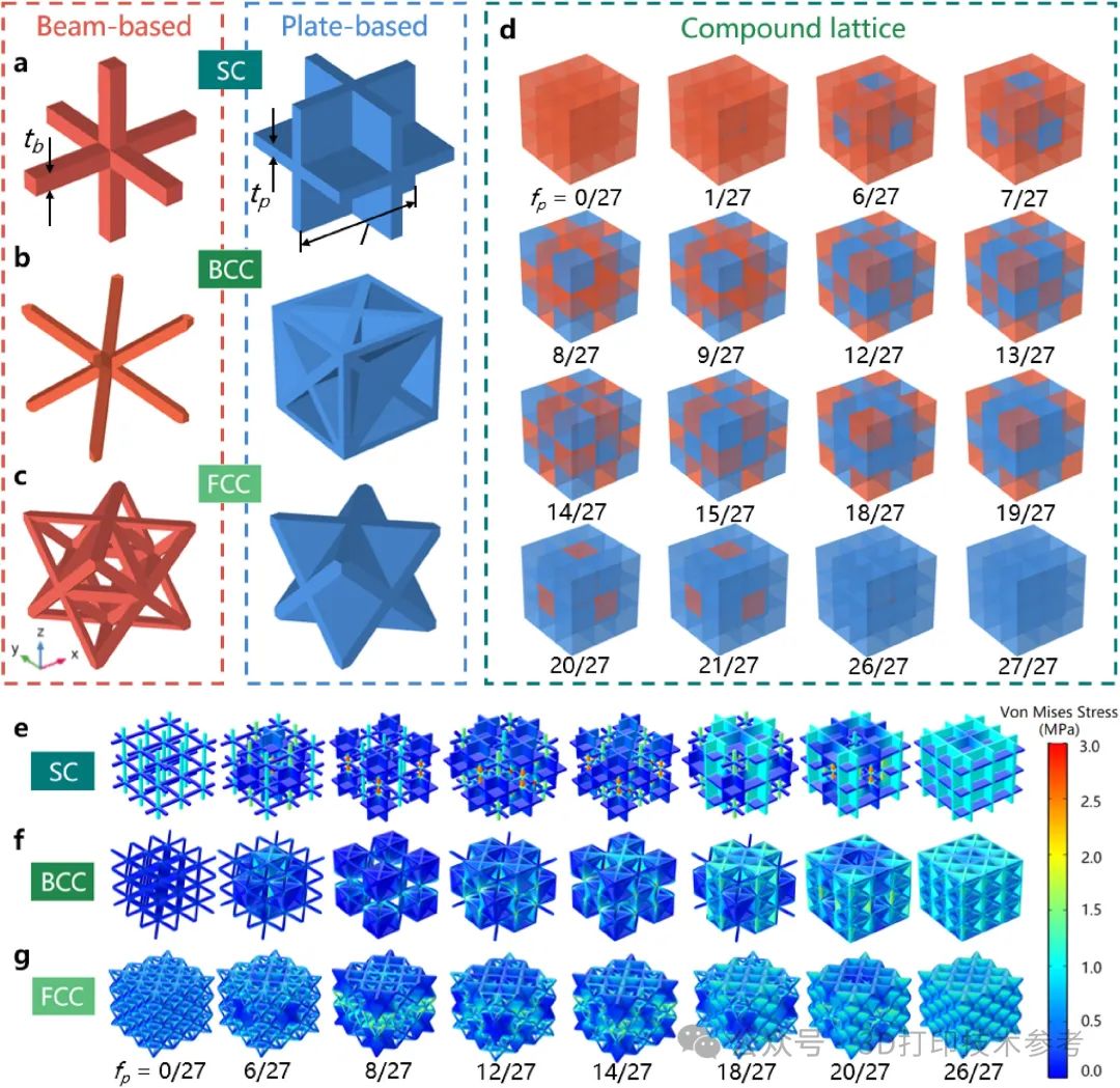 梁-板复合晶格:简单立方体b、体心立方体c和面心立方体设计的梁单元晶格(橙色)和板单元晶格(蓝色)的示意图。几何形状由单元晶格的长度l、梁的厚度tb和板的厚度tp决定。d 3×3×3复合晶格的不同设计。fp指的是基于板的单元晶格(蓝色)的比例。在单轴加载模拟下,整体应变为0.001时,获得的简单立方体e、体心立方体f和面心立方体g复合晶格的典型应力分布