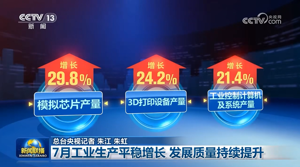 据央视新闻报道,7月份我国3D打印设备产量同比增长24.2%,与模拟芯片(29.8%)、工业控制计算机(21.4%)等共同拓展增长点。
