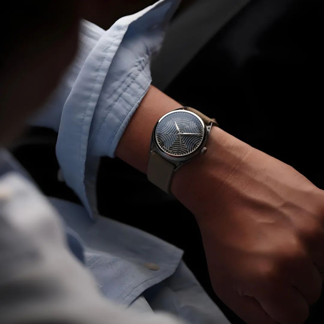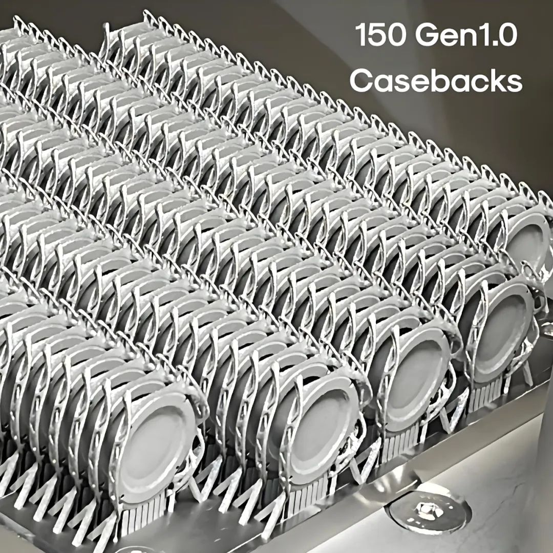 Gen1.0于8月15日推出,其轻盈的镂空结构与Holthinrichs手表类似,但更具未来感;它们的表壳看起来像是由某种巨型蜘蛛编织而成,与钛金属表盘的设计类似。超轻23级钛金属的纹理饰面与抛光斜角表圈相得益彰,后者环绕着蜘蛛网状表盘。表盘本身是3D打印5级钛金属中壳的一部分。中壳外部采用CNC加工,对比之下突出了表背的异域风情结构。Gen1.0的首发售价为1875英镑,超过75%的零部件在英国制造,重量仅为38克。