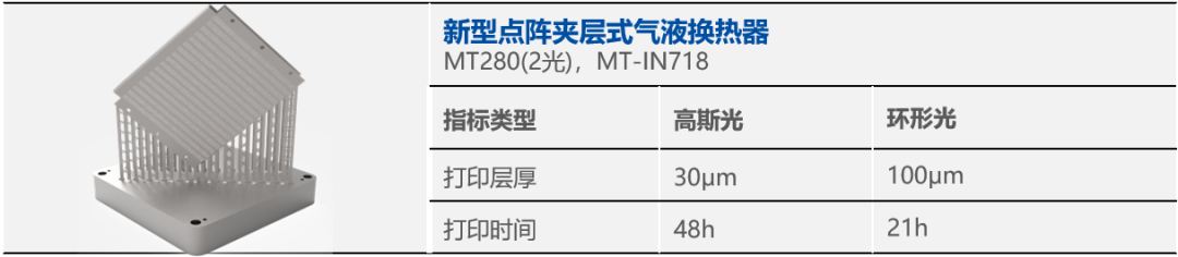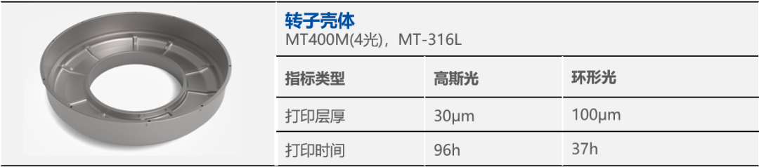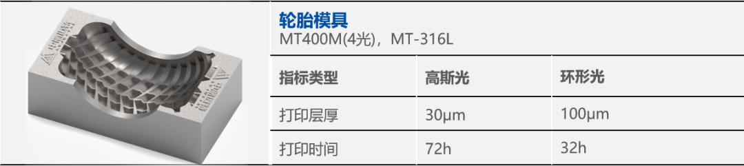 同设备、同工件打印条件下,中航迈特开展了轮胎模具、点阵换热器及固定底座等系列典型构件成形效率验证,协同使用大层厚环形光(层厚60-120μm)与小层厚高斯光(层厚30-60μm)打印,相较于高斯光烧结效率,打印效率提升100%以上。