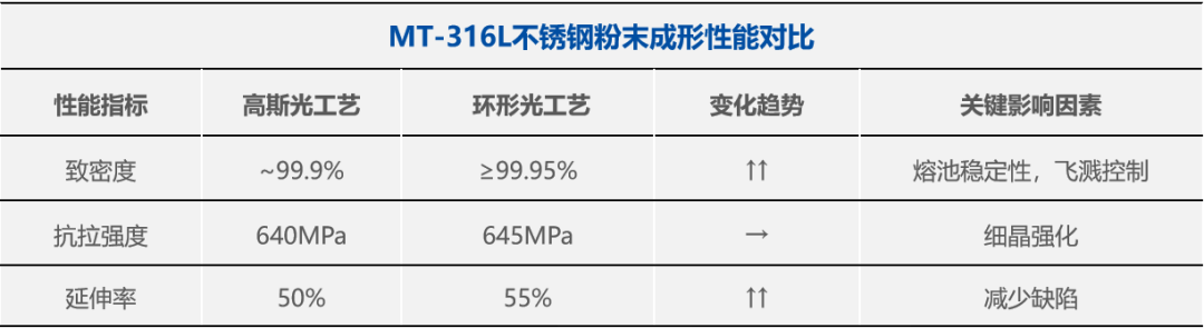 采用集成光束整形技术的MT400M金属3D打印机,开展MT-316L不锈钢粉末材料打印性能验证,各项性能指标表现优异:材料致密度≥99.95%、抗拉强度645MPa、延伸率55%,综合性能优于常规高斯光模式。