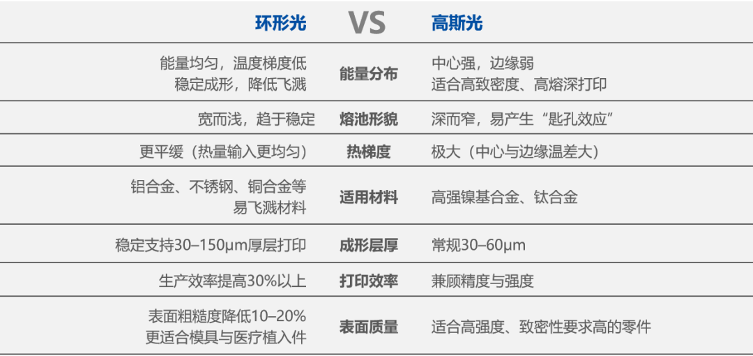 高斯光作为当前金属3D打印领域的主流光源,中心能量集中,适用于精细结构高效熔化,但在高功率、大层厚打印中易引发气孔和飞溅,影响零件力学性能。环形光技术将能量重新分布为环状对称结构,中心能量接近为零,能量分布与高斯光协同互补,可有效减少飞溅与缺陷,提升熔池稳定性。