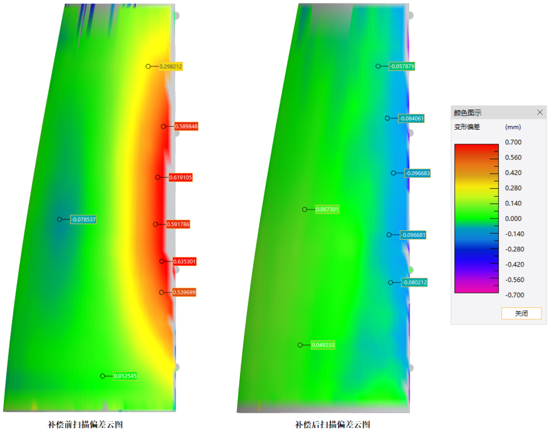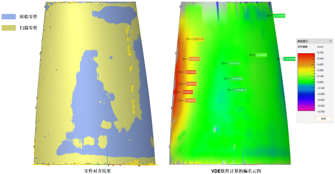 使用高精度三维扫描仪RigelScan Plus采集数据,获取STL格式模型,并导入VDE软件与原始CAD模型进行对比。通过“粗配准(点对匹配/PCA)+精配准(ICP)”统一模型位置后,软件自动生成全域偏差云图(黄/红为正偏差、深蓝/紫为负偏差、绿/浅蓝在公差内),清晰显示变形情况,此次测试中原始打印件尖端和边缘出现±0.7mm严重变形。