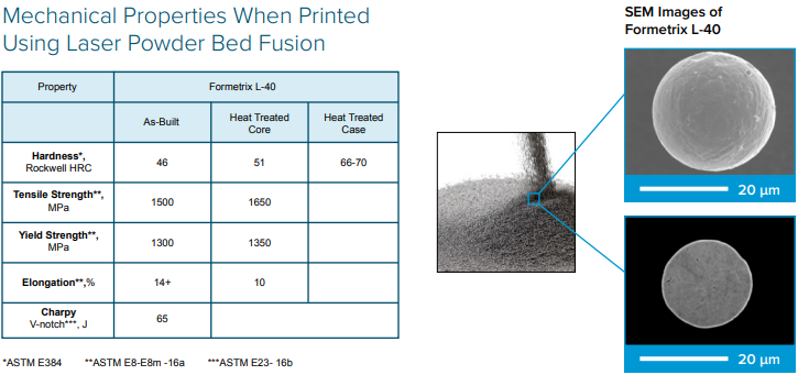 MacLean-Fogg研发的L-40钢是一种专为压铸工具3D打印工艺开发的新型粉末。与传统工具钢相比,L-40在3D打印和热处理过程中的开裂倾向显著降低。即使在成品状态下,L-40 也能达到较高的尺寸精度,并在硬度(48 HRC)、抗拉强度(1420 MPa)和缺口冲击强度(>60 J)方面表现出色。全面的测试已成功验证了新机器在复杂几何形状(例如带有圆形或悬垂式冷却通道)中的制造能力。