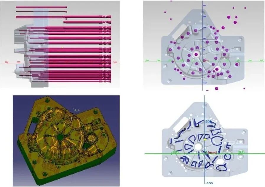 冷却水道设计:新形状取代了传统的针状冷却(上图),包含复杂的共形冷却水路(下图)