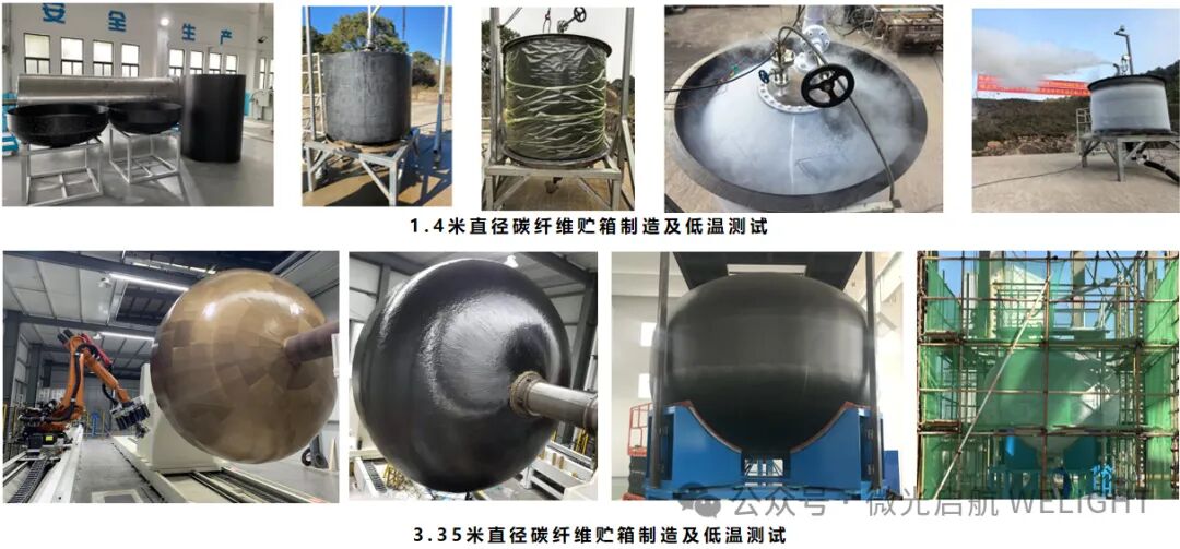 微光启航在碳纤维复合材料火箭结构研发上取得重大突破。通过采用改性高性能低温环氧树脂及先进碳纤维材料,已成功完成1.4米和3.35米直径碳纤维贮箱的制造及严苛低温特性测试,关键指标(液氧相容性、低温密封性、蒸发量等)均满足设计要求。