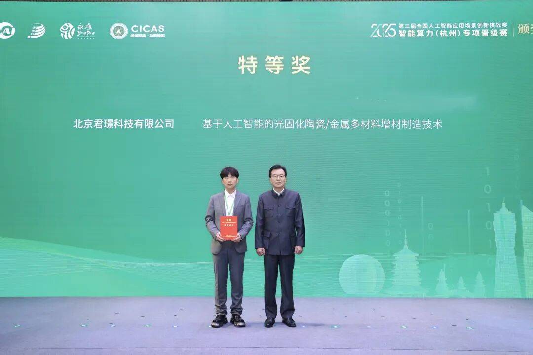 11月1日,2025算力网发展大会暨第三届全国人工智能应用场景创新挑战赛(CICAS)智能算力专项赛闭幕式在杭州收官。来自北京君璟科技有限公司的“基于人工智能的光固化陶瓷/金属多材料增材制造技术”获特等奖。