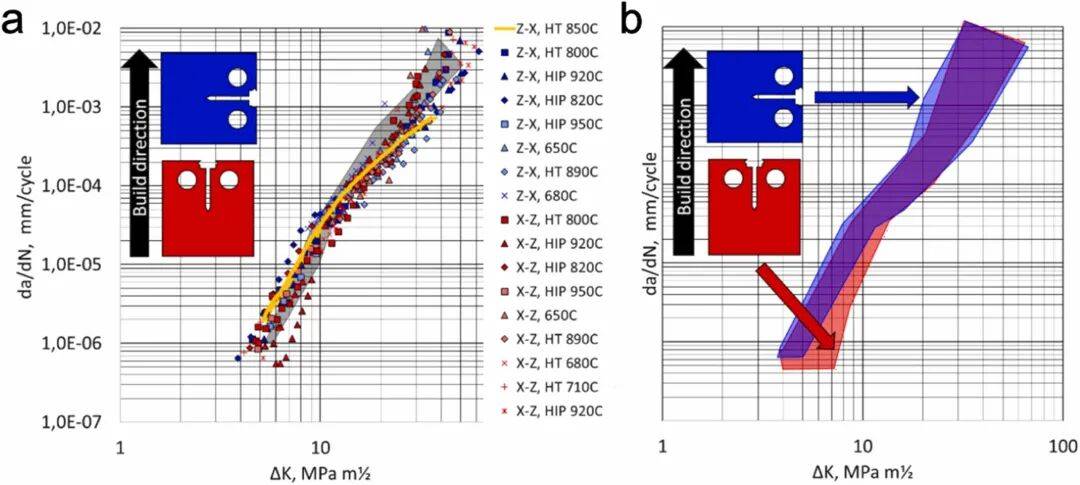 不同处理(HIP和热处理)下L-PBF Ti-64的疲劳裂纹扩展速率,以及与常规制造的Ti-64的比较