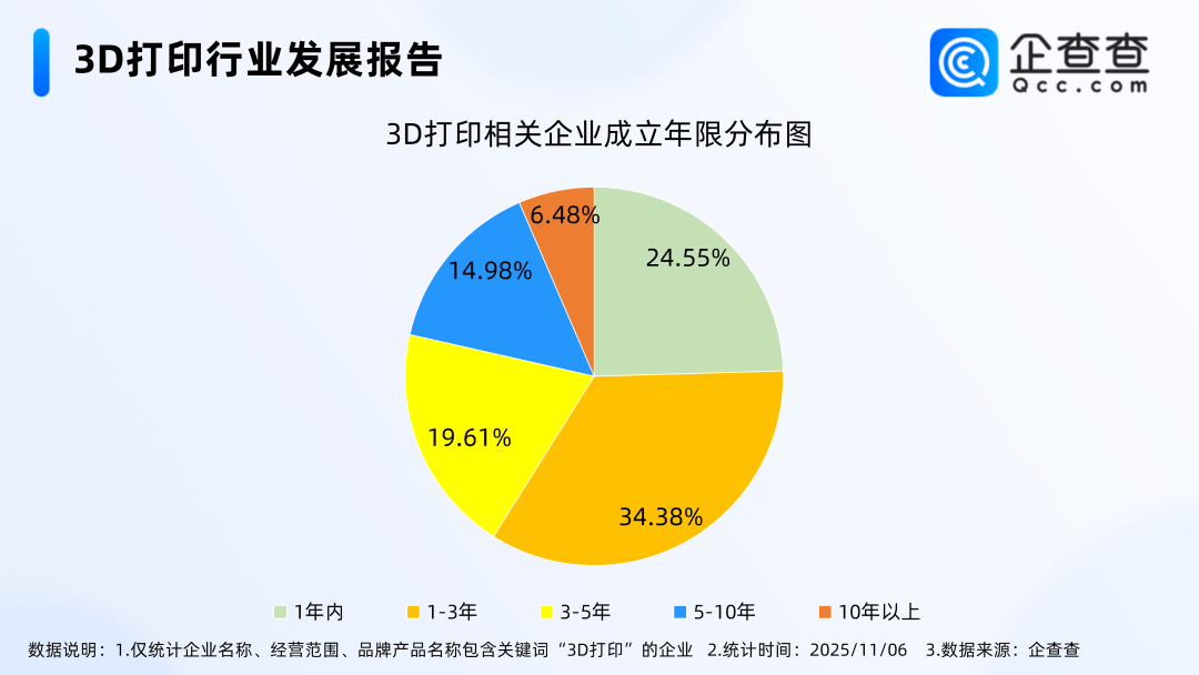11月6日,企查查财经发文称,截至今日,国内现存3D打印相关企业18.28万家。从经营时间来看,成立年限在1-3年的相关企业最多,占比34.38%。从城市能级分布来看,今年新注册的3D打印相关企业多分布在一线城市,占比25.90%。